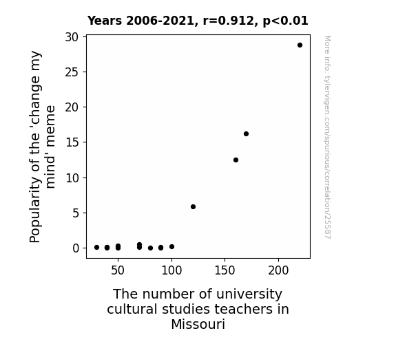 This means 83.1% of the change in the one variable (i.e., The number of university cultural studies teachers in Missouri) is predictable based on the change in the other (i.e., Popularity of the 'change my mind' meme) over the 16 years from 2006 through 2021.