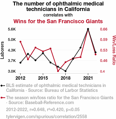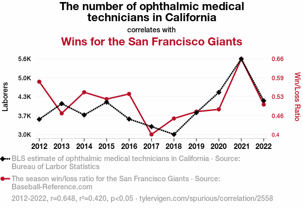 User prompt: Please provide potential search keywords for a paper titled Astonishing Alliteration: Assessing the Association Between Ophthalmic Medical Technicians in California and Wins for the San Francisco Giants with an abstract of This study investigates the obscure relationship between the number of ophthalmic medical technicians in California and the performance of the San Francisco Giants. By meticulously analyzing data from the Bureau of Labor Statistics and Baseball-Reference.com, a curious correlation coefficient of 0.6478212 and p < 0.05 for the period spanning 2012 to 2022 was discovered. Our findings suggest a statistically significant connection between these seemingly unrelated factors, shedding light on an unexpected and peculiar association that may influence the outcome of baseball games. This research encourages further investigation into the whimsical and enigmatic interplay of seemingly unrelated variables, reminding us that in the world of statistics, one must always keep an eye out for the unforeseen.