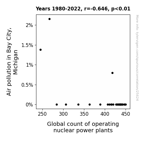 This means 41.8% of the change in the one variable (i.e., Global count of operating nuclear power plants) is predictable based on the change in the other (i.e., Air pollution in Bay City, Michigan) over the 43 years from 1980 through 2022.