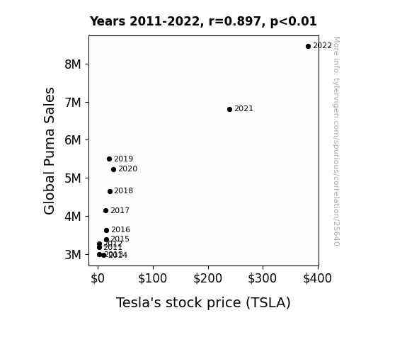 This means 80.4% of the change in the one variable (i.e., Tesla's stock price (TSLA)) is predictable based on the change in the other (i.e., Global Puma Sales) over the 12 years from 2011 through 2022.