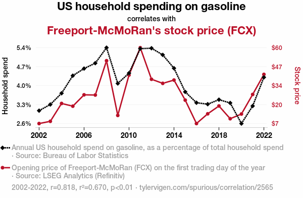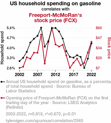 - The spurious research paper: Fueling Financial Fluctuations: Exploring the Link between US Household Gasoline Spending and Freeport-McMoRan's Stock Price