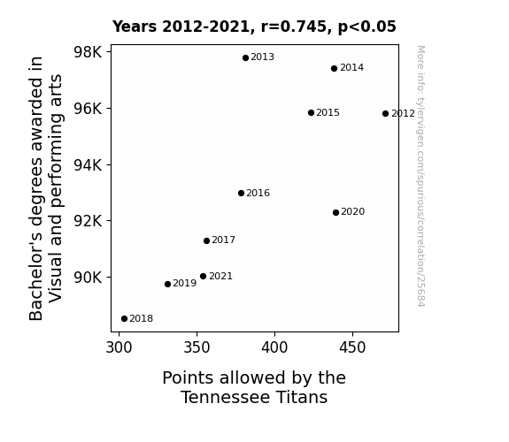 This means 55.4% of the change in the one variable (i.e., Points allowed by the Tennessee Titans) is predictable based on the change in the other (i.e., Bachelor's degrees awarded in Visual and performing arts) over the 10 years from 2012 through 2021.