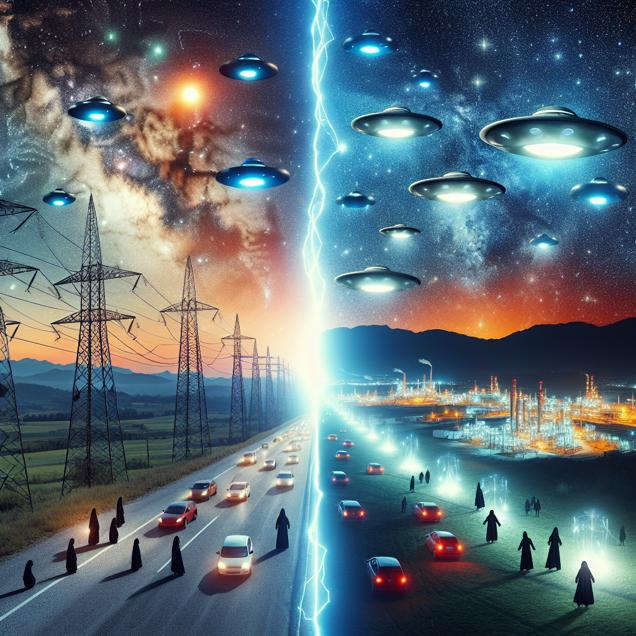 ChatGPT: Generate an image of a night sky split between Alabama and Trinidad and Tobago. In Alabama, show UFOs hovering above, with residents looking up in amazement. There should be visible indications of increased electricity demand, such as local power lines glowing brighter. In Trinidad and Tobago, depict bright lights from power plants attracting curious UFOs, creating a surge in extraterrestrial activity. The scene should convey the universal attraction between the UFOs and electric connections, creating a sense of true extraterrestrial power play.