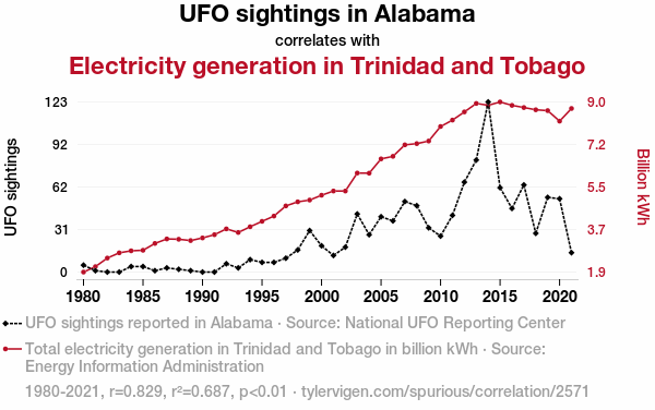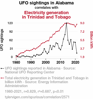 Your research team used data from National UFO Reporting Center and Energy Information Administration to assess this nagging question. You found a correlation coefficient of 0.8287277 and p < 0.01 for 1980 to 2021.