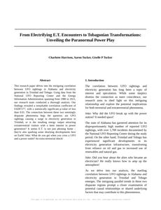 User prompt: Please provide potential search keywords for a paper titled From Electrifying E.T. Encounters to Tobagonian Transformations: Unveiling the Paranormal Power Play with an abstract of This research paper delves into the intriguing correlation between UFO sightings in Alabama and electricity generation in Trinidad and Tobago. Using data from the National UFO Reporting Center and the Energy Information Administration spanning from 1980 to 2021, our research team conducted a thorough analysis. Our findings revealed a remarkable correlation coefficient of 0.8287277, with a statistically significant p-value of less than 0.01.