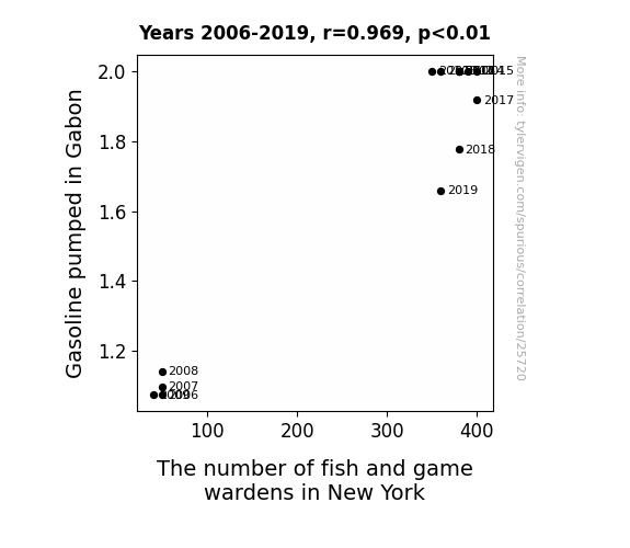 This means 93.9% of the change in the one variable (i.e., The number of fish and game wardens in New York) is predictable based on the change in the other (i.e., Gasoline pumped in Gabon) over the 14 years from 2006 through 2019.