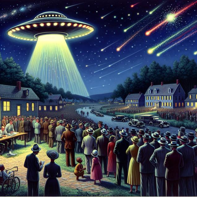 User prompt: Please respond with an image generation prompt that would be likely to create an interesting visual using DALLE-3, using the following style: [ A scene from A Disney Movie ] and depicting this scene: In a quiet town in Pennsylvania, people gaze up at the night sky, gasping in awe as they spot a UFO zipping through the stars. Meanwhile, in a bustling US Patent Office, a line of inventors eagerly wait to receive their approved patents, with a notable surge in applications from Pennsylvania. The scene captures the collision of extraterrestrial wonder and human ingenuity, as the alien visitors inspire a new wave of innovative ideas being patented across the country. Keep the visual depiction simple. Do not include any words or speech bubbles.