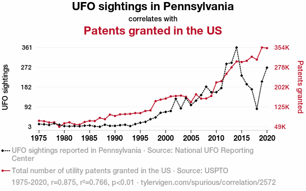 Your research team used data from National UFO Reporting Center and USPTO to assess this nagging question. You found a correlation coefficient of 0.8751898 and p < 0.01 for 1975 to 2020.