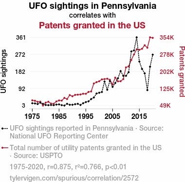 This means 76.6% of the change in the one variable (i.e., Patents granted in the US) is predictable based on the change in the other (i.e., UFO sightings in Pennsylvania) over the 46 years from 1975 through 2020.
