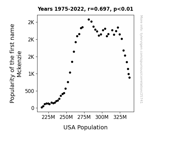 This means 48.6% of the change in the one variable (i.e., USA Population) is predictable based on the change in the other (i.e., Popularity of the first name Mckenzie) over the 48 years from 1975 through 2022.