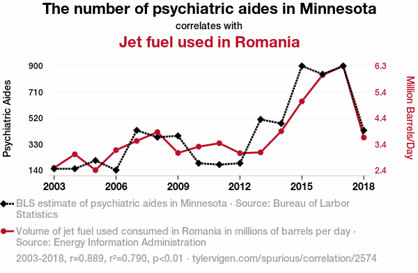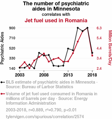 psychiatric aides, jet fuel, Minnesota, Romania, correlation, Bureau of Labor Statistics, Energy Information Administration, surprising correlation coefficient, significance level, reevaluation of connections, unexpected pairings, insights