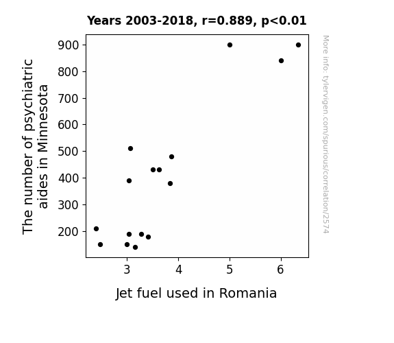 This means 79% of the change in the one variable (i.e., Jet fuel used in Romania) is predictable based on the change in the other (i.e., The number of psychiatric aides in Minnesota) over the 16 years from 2003 through 2018.
