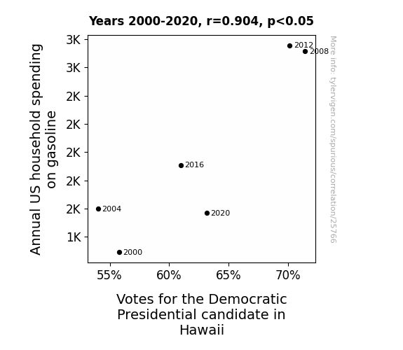 This means 81.7% of the change in the one variable (i.e., Votes for the Democratic Presidential candidate in Hawaii) is predictable based on the change in the other (i.e., Annual US household spending on gasoline) over the 6 years from 2000 through 2020.
