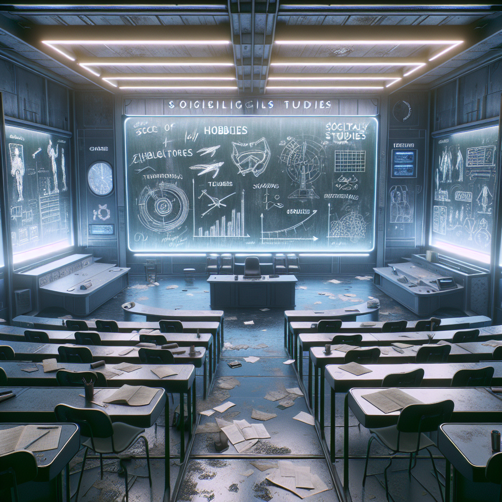 User prompt: Please respond with an image generation prompt that would be likely to create an interesting visual using DALLE-3, using the following style: [ Futuristic ] and depicting this scene: In an empty classroom at a Tennessee college, the desks sat deserted as the number of sociology teachers dwindled. On the chalkboard, a few fading "xkcd" comics about hobbies were the only remnants of the once lively "ethnograph" of hobbyist culture. The absence of professors to "parse" through theories led to a dramatic drop in the "scroll of hobbies" in the xkcd universe - a sociologically significant correlation. Keep the visual depiction simple. Do not include any words or speech bubbles.