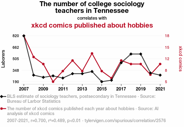 User prompt: Please make up a funny explanation for how a decrease in The number of college sociology teachers in Tennessee caused xkcd comics published about hobbies to decrease.