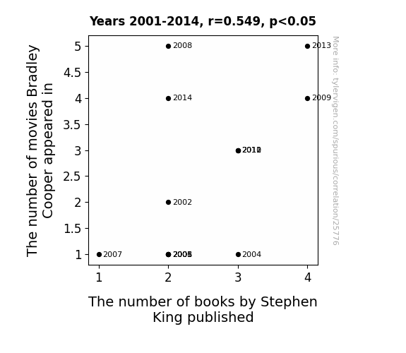This means 30.2% of the change in the one variable (i.e., The number of books by Stephen King published) is predictable based on the change in the other (i.e., The number of movies Bradley Cooper appeared in) over the 14 years from 2001 through 2014.