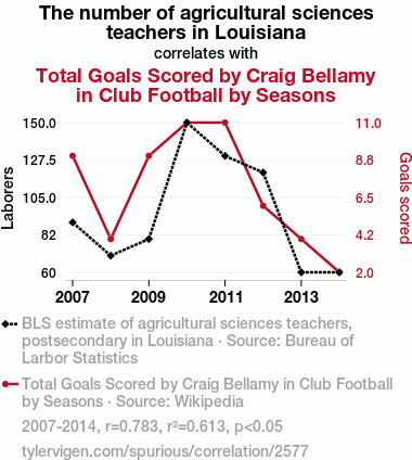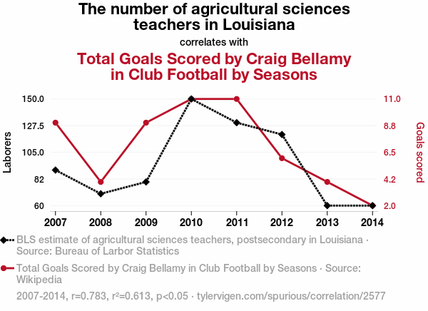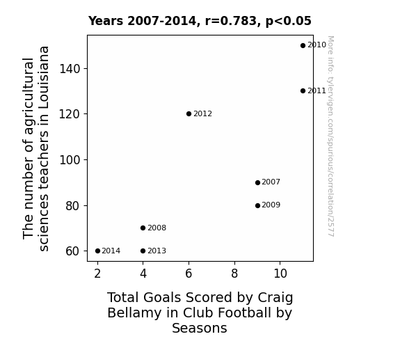 - The spurious research paper: Croppin' Goals: Exploring the Correlation Between Agricultural Sciences Teachers in Lousiana and Craig Bellamy's Club Football Performance