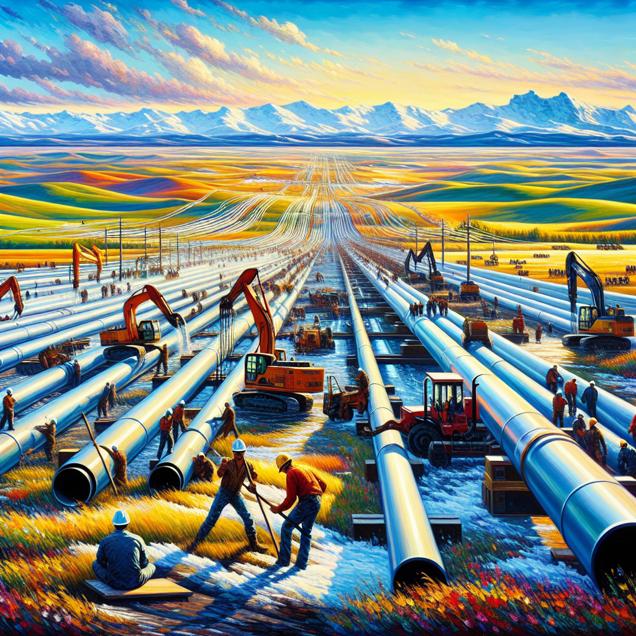 Prompt: Generate an image that depicts a breathtaking landscape in North Dakota, where fields are filled with busy pipelayers working on constructing new pipelines. The scene should be vibrant and dynamic, showcasing the movement and energy of the worksite. The focus should be on the pipelines being constructed, with attention to detail on the machinery and workers. The image should also convey an atmosphere of industry and progress, capturing the essence of the increased activity in the area. The depiction should include only scenes, people, and objects, it should not include text or speech bubbles.