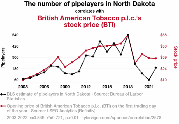 Our analysis of the data spanning from 2003 to 2022 has produced some eyebrow-raising findings. The correlation coefficient between the number of pipelayers in North Dakota and the stock price of British American Tobacco p.l.c. (BTI) came in at a surprising 0.8491579. This strong positive correlation astounded us more than finding a kangaroo in a coffee shop, especially given the seemingly independent nature of these two entities.