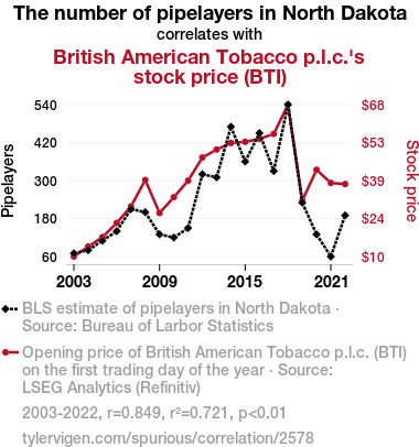 User prompt: Please provide potential search keywords for a paper titled Pipelayers in North Dakota and Puffing on BTI: A Peculiar Partnership with an abstract of In this scholarly exploration, we dive into the unlikely connection between the number of pipelayers in North Dakota and the stock price of British American Tobacco p.l.c. (BTI). While one might expect tobacco sales to go up in smoke alongside pipeline activity, our research paints a different picture. Utilizing data from the Bureau of Labor Statistics and LSEG Analytics (Refinitiv), we delved into the numbers from 2003 to 2022 to uncover the correlation coefficient of 0.8491579, with a significant p-value of less than 0.01.