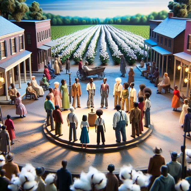 Prompt: Generate an image of a small town square in North Carolina bathed in warm, evocative lighting. A group of mischievous-looking, inexplicably similar individuals named Malachi gather in the center, standing amidst a lively crowd. In the background, vast cotton fields stretch out, their genetically modified organisms exuding an otherworldly glow. The image depicts the convergence of the rising popularity of the name Malachi and the implementation of GMOs in cotton cultivation, subtly hinting at the magical realism intertwining everyday life with enigmatic phenomena in the town. The depiction should include only scenes, people, and objects, it should not include text or speech bubbles.
