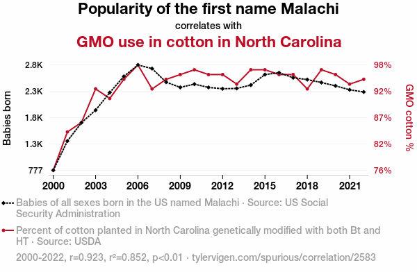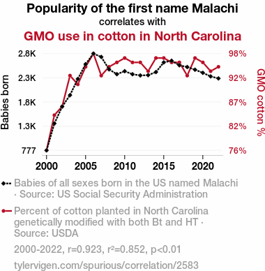 This means 85.2% of the change in the one variable (i.e., GMO use in cotton in North Carolina) is predictable based on the change in the other (i.e., Popularity of the first name Malachi) over the 23 years from 2000 through 2022.