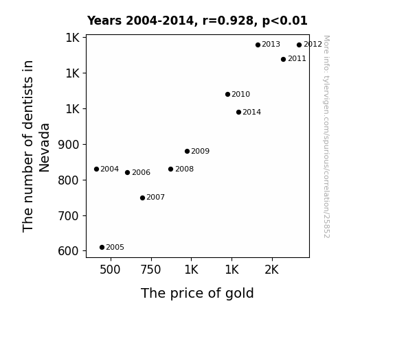 This means 86.2% of the change in the one variable (i.e., The price of gold) is predictable based on the change in the other (i.e., The number of dentists in Nevada) over the 11 years from 2004 through 2014.