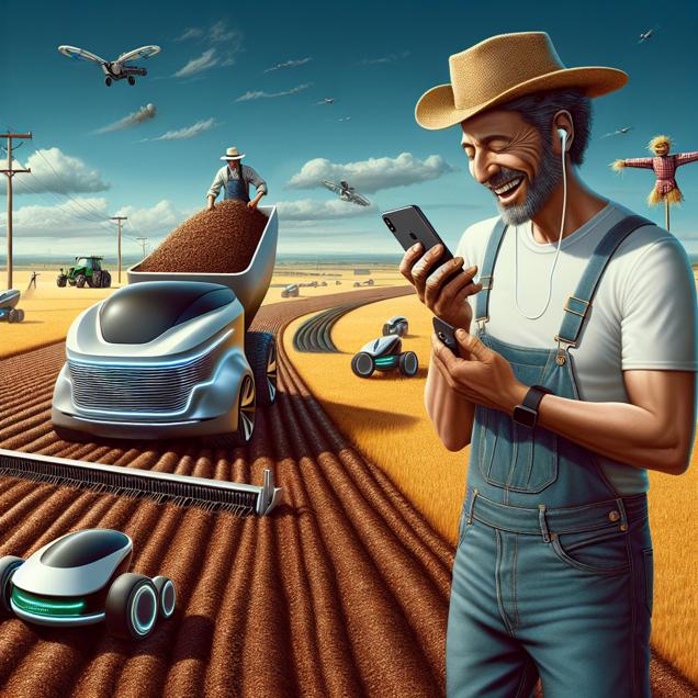 User prompt: Please respond with an image generation prompt that would be likely to create an interesting visual using DALLE-3, using the following style: [ High-tech ] and depicting this scene: In an open field, a farmer unloads bags of dried manure from a truck while reading an xkcd comic about artificial intelligence on his phone, laughing at the humorous depiction of AI. In the distance, a scarecrow wears a hat with an xkcd logo, while nearby, a small robot helper assists in spreading the manure across the field. Keep the visual depiction simple. Do not include any words or speech bubbles.