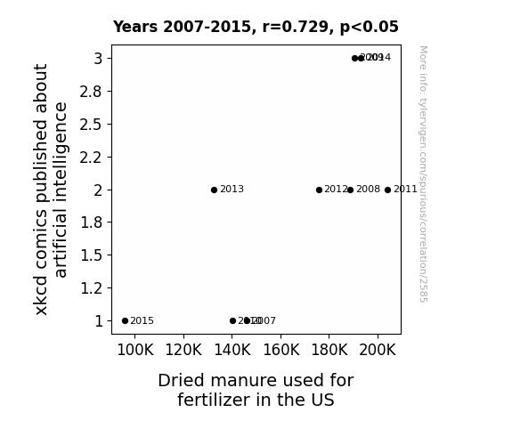 Our findings revealed a remarkably strong correlation between the publication of XKCD comics about artificial intelligence and the utilization of dried manure as fertilizer in the United States. The correlation coefficient of 0.7292790 indicated a substantial positive relationship between the two variables, with an r-squared value of 0.5318479 suggesting that approximately 53.18% of the variability in the use of dried manure can be explained by the publication of AI-themed XKCD comics.