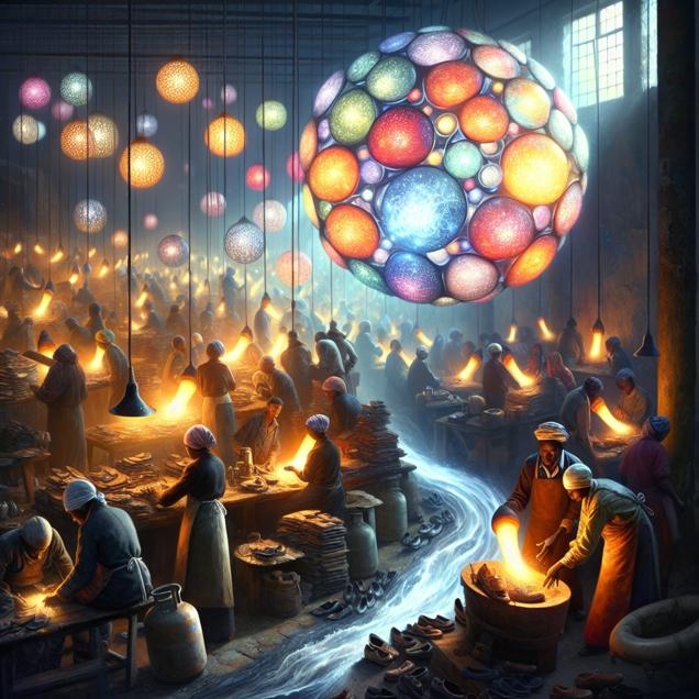 ChatGPT: An image depicting a dimly lit shop floor in Maine, filled with shoe and leather workers bent over their workstations, cobbling and repairing shoes. The air is filled with a soft glow as the workers' movements generate shimmering Liquefied Petroleum Gas molecules, visible as colorful, translucent orbs. These orbs begin to gently float upwards, forming a swirling trail that extends across the Atlantic ocean to Zambia, where they materialize into actual gas stoves and other LPG-powered devices being used by families to cook and warm their homes.