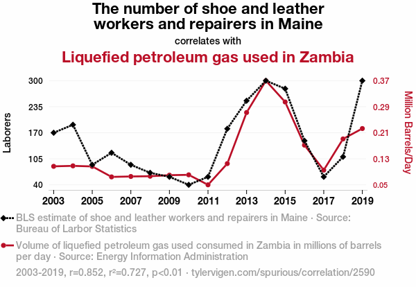 User prompt: Please provide potential search keywords for a paper titled Putting the Sole in LPG: The Unlikely Link between Shoe and Leather Workers in Maine and Liquefied Petroleum Gas Usage in Zambia with an abstract of This study explores the unexpected relationship between the number of shoe and leather workers and repairers in Maine and the consumption of liquefied petroleum gas (LPG) in Zambia. Utilizing data from the Bureau of Labor Statistics and the Energy Information Administration, our research team aimed to investigate this seemingly incongruous connection. Our findings revealed a striking correlation coefficient of 0.8524589 and a p-value less than 0.01 for the time period spanning from 2003 to 2019.