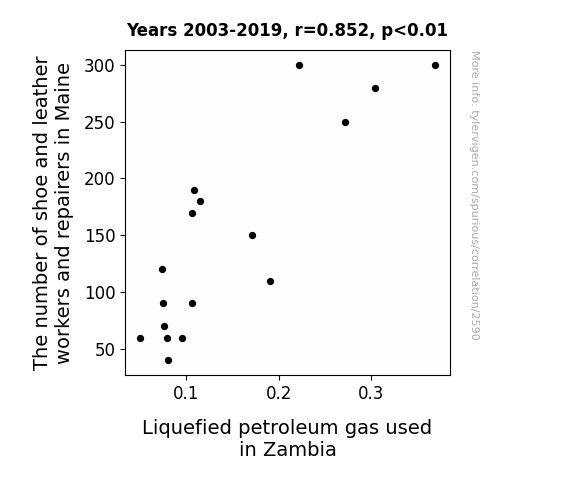 In conclusion, the results of this research demonstrate an unexpected but undeniable connection between the number of shoe and leather workers and repairers in Maine and the consumption of liquefied petroleum gas in Zambia. This peculiar correlation challenges traditional economic wisdom and offers a fascinating glimpse into the intricate tapestry of global economic relationships. As we peel back the layers of this unexpected phenomenon, we invite fellow scholars to join us in untangling the threads of economic interconnectedness, and who knows, maybe even cobble together a few more surprising discoveries along the way.