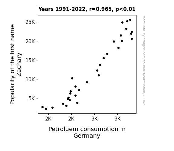 This means 93.1% of the change in the one variable (i.e., Petroluem consumption in Germany) is predictable based on the change in the other (i.e., Popularity of the first name Zachary) over the 32 years from 1991 through 2022.
