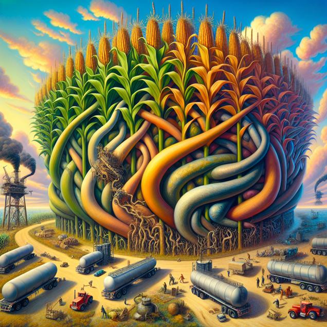 Prompt: Prompt: Given the style of [Symbolism], create an image of a surreal and abstract representation of the interconnected relationship between genetically modified corn production in Illinois and the dependence on fossil fuels in Cuba. Consider incorporating visual cues of immense cornstalks intertwining with oil tankers, evoking a sense of perplexing reliance and interconnectedness between agricultural and energy systems. Emphasize the urgency and turmoil of this relationship through contrasting visual elements, infusing the scene with a sense of surrealism and depth. The depiction should include only scenes, people, and objects, it should not include text or speech bubbles.