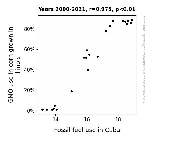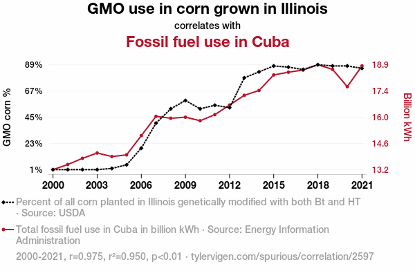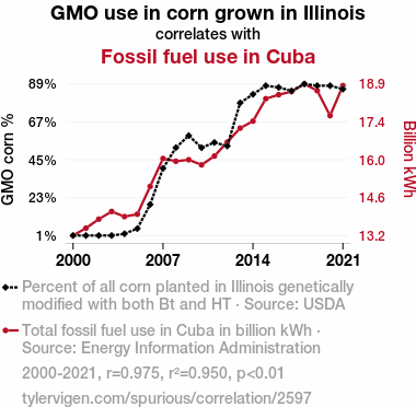 This means 95% of the change in the one variable (i.e., Fossil fuel use in Cuba) is predictable based on the change in the other (i.e., GMO use in corn grown in Illinois) over the 22 years from 2000 through 2021.
