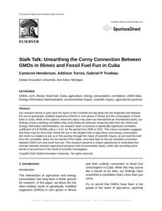 User prompt: Please provide potential search keywords for a paper titled Stalk Talk: Unearthing the Corny Connection Between GMOs in Illinois and Fossil Fuel Fun in Cuba with an abstract of Our research aimed to peel back the layers of the cornfield and dig deep into the enigmatic link between the use of genetically modified organisms (GMOs) in corn grown in Illinois and the consumption of fossil fuels in Cuba. While at first glance, these two topics may seem as mismatched as mismatched socks, our findings unveil a startling correlation that could barley be believed.