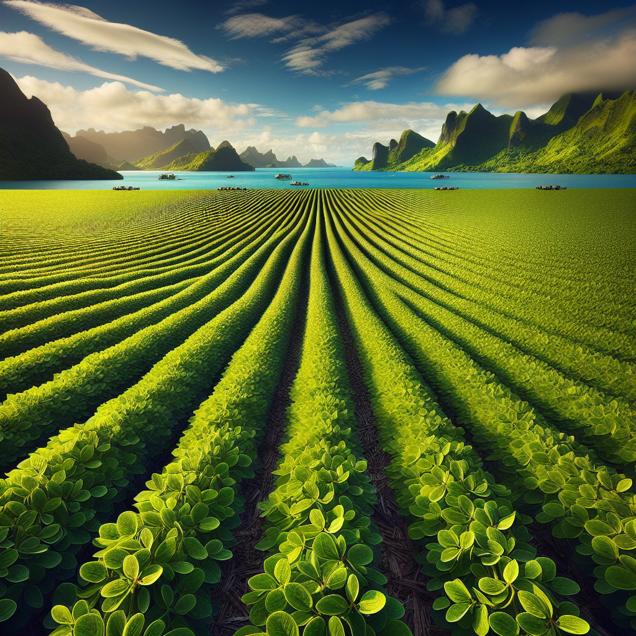 User prompt: Please describe a visual scene that prominently depicts both GMO use in soybeans in Indiana and Petroluem consumption in French Polynesia, in the following situation: As the soybeans in Indiana became more genetically modified, they inadvertently started producing a gas that, when combined with the air in French Polynesia, created a unique blend of biofuel, leading to a surge in demand for petroleum. This new biofuel blend was so in demand, even the islands couldn't resist the soy-powered wave. We could say the soybeans really fueled a global connection!. Keep the description simple.