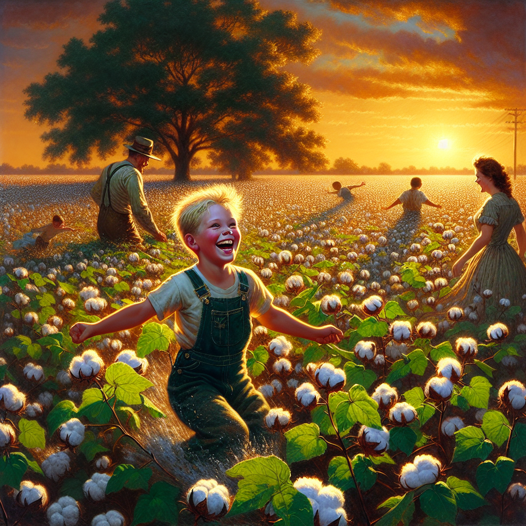 ChatGPT: An image that looks like it is a scene from A Disney Movie: In a sun-kissed Missouri cotton field, a young boy named Eddy exudes joy as he skips through the thriving plants. The cotton field is a patchwork of lush greens and puffy white, with the boy's playful laughter echoing through the air. Surrounding the scene, the proud parents stand with content smiles, gazing at their son with a sense of fulfillment as the golden light of the setting sun bathes the entire setting in a warm, magical glow.