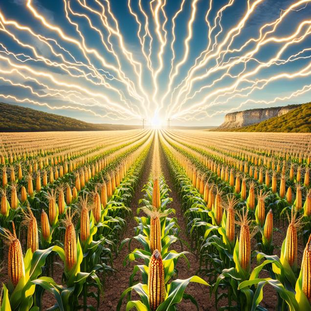 ChatGPT: Generate an image of towering rows of genetically modified corn in a Texas field, with electricity arcing between the vibrant maize plants, illuminating the surroundings with sparks of energy. Show the unconventional connection between agriculture and electricity, and the transformation of the landscape as this electrical surge sparks a revolution, changing the face of energy production in Cabo Verde.