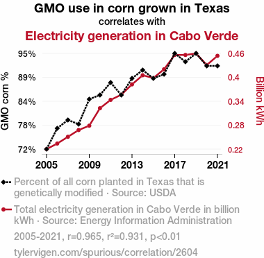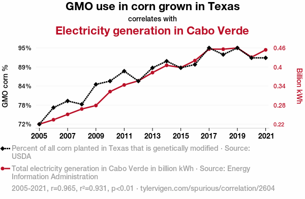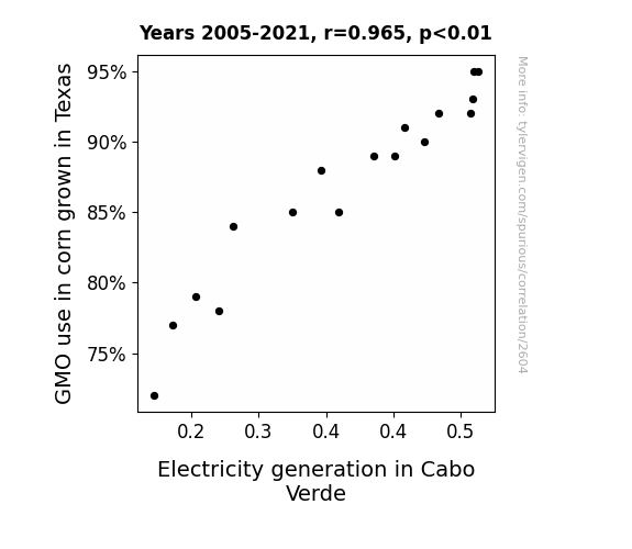 This means 93.1% of the change in the one variable (i.e., Electricity generation in Cabo Verde) is predictable based on the change in the other (i.e., GMO use in corn grown in Texas) over the 17 years from 2005 through 2021.