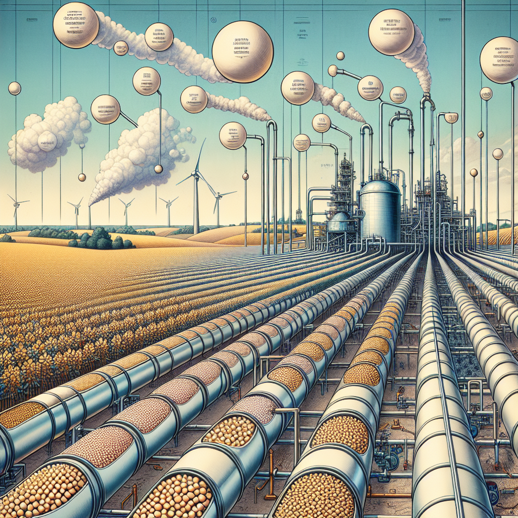 User prompt: Please respond with an image generation prompt that would be likely to create an interesting visual using DALLE-3, using the following style: [ High-tech ] and depicting this scene: In Iowa, rows of GMO soybeans stand tall in a field, each bean bursting with potential. But these beans seem to be full of more than just nutrients - they're letting out continuous fart-like emissions, filling the air with methane. Large tubes stretch across the ocean, connecting to a geothermal power plant in Russia. The tubes are filled with the potent gas, creating a curious and unexpected partnership between the soybeans and the geothermal plant. Keep the visual depiction simple. Do not include any words or speech bubbles.