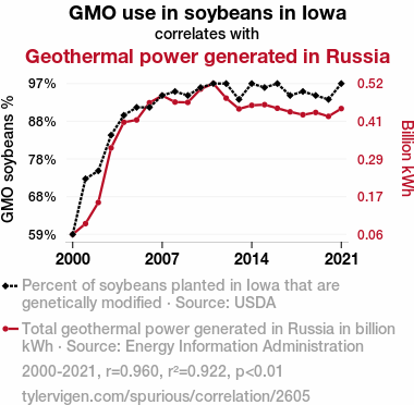 GMO soybeans, Iowa, geothermal energy, Russia, correlation, genetically modified organisms, soybean cultivation, agriculture, geothermal power, statistical association, United States Department of Agriculture, Energy Information Administration, correlation coefficient, p-value, agriculture practices, energy landscape, Eurasia, interdisciplinary discourse, global sustainability