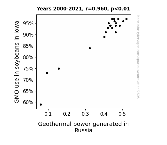 Figure 1 depicts a scatterplot illustrating the remarkably strong correlation between the adoption of GMO soybeans in Iowa and the production of geothermal energy in Russia, though it regrettably fails to capture the essence of a soybean whispering its secrets to a geyser in the Siberian wilderness.