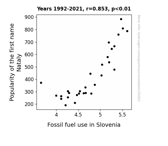 This means 72.8% of the change in the one variable (i.e., Fossil fuel use in Slovenia) is predictable based on the change in the other (i.e., Popularity of the first name Nataly) over the 30 years from 1992 through 2021.