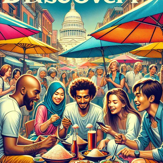 ChatGPT: Generate an image of a bustling street market in a vibrant city, with people from diverse cultures gathered under colorful umbrellas, enjoying steaming rice dishes. Show a group of friends laughing and sharing stories while savoring their aromatic meals, exuding a sense of adventure and connectivity. Include a few individuals in the background browsing on their phones, hinting at the seeds of wanderlust and the desire to move to Europe. Capture the lively and bustling atmosphere of this multicultural gathering in an immersive and visually engaging style, resembling a captivating cover image of a Discovery magazine.