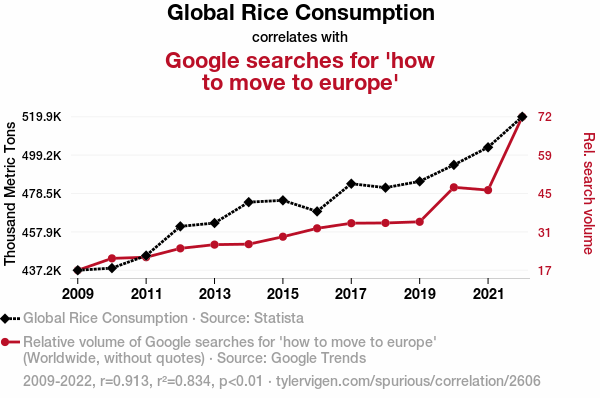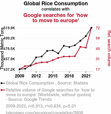 User prompt: Please make up a funny explanation for how an increase in Global Rice Consumption caused how to move to europe (Google searches for 'how to move to europe') to increase. Add a funny one-liner at the end.
