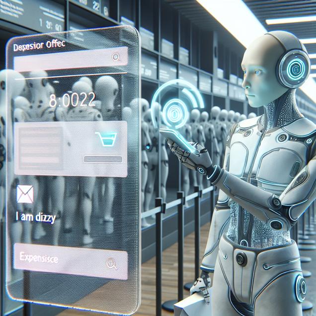 Prompt: Generate an image of a futuristic post office where a humanoid figure is standing in line, holding a letter, and looking slightly confused. The figure is wearing futuristic clothing and has a holographic phone in hand, with a search bar displaying "i am dizzy." In the background, display a translucent holographic image showing the cost to send a letter via USPS. The scene should exude a sense of advanced technology and modernity. The depiction should include only scenes, people, and objects, it should not include text or speech bubbles.