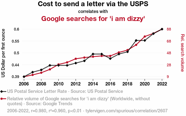 This means 96% of the change in the one variable (i.e., Google searches for 'i am dizzy') is predictable based on the change in the other (i.e., Cost to send a letter via the USPS) over the 17 years from 2006 through 2022.