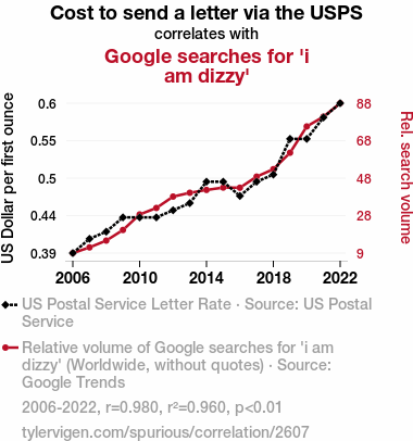 The uncovering of a robust correlation between the cost to send a letter via the United States Postal Service (USPS) and the frequency of Google searches for 'I am dizzy' has sent ripples through the academic community, reminiscent of the sensation one experiences during an unexpected bout of vertigo. Our results not only echo the prior research that probed the labyrinthine entanglement of seemingly unrelated phenomena, but they also shed light on the intricate dance between postal economics and virtual expressions of disorientation.