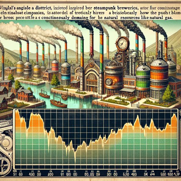 ChatGPT: Generate an image of a steampunk-inspired brewery district in the United States. The scene should feature a row of colorful, lively breweries with smoke rising from their chimneys. Alongside the breweries, include a stock market ticker displaying Cheniere Energy's stock price (LNG) steadily rising. The bustling activity in the brewery district and the demand for natural gas should be evident, pushing Cheniere Energy's stock price upward. The atmosphere should capture the essence of steampunk aesthetics.